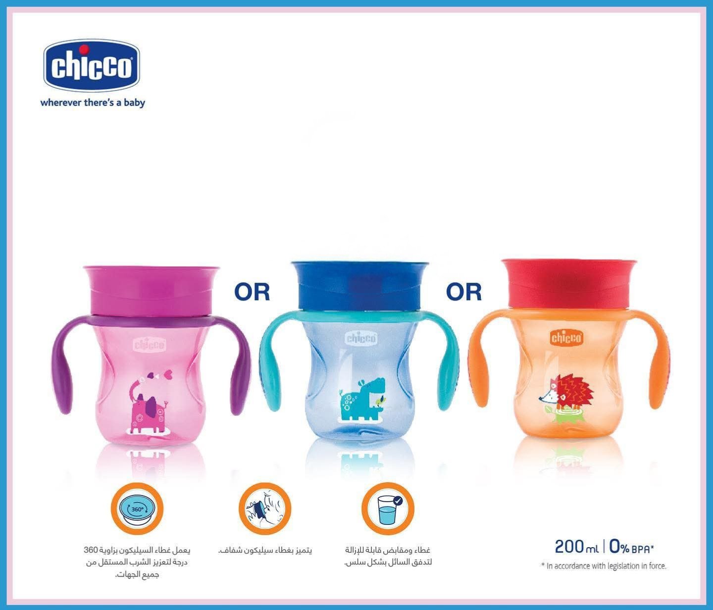 كوب شيكو 360 درجة مثالي للأطفال بعمر 12 شهر فأكثر، يساعد الطفل على الانتقال بسهولة من المص إلى الشرب بطريقة طبيعية. يتميز بحافة مريحة لوضع الشفاه وتصميم مانع للتسرب، مع سعة 200 مل مناسبة للاستخدام اليومي في المنزل أو أثناء التنقل
